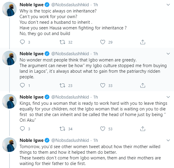 Tomorrow, you’d see other women tweet about how their mother willed things to them and how it helped them do better. These tweets don’t come from Igbo women, them and their mothers are waiting for their father to die first.