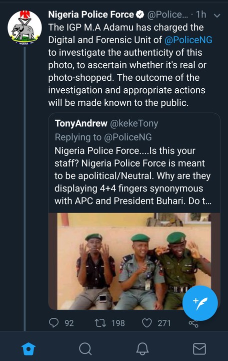 The Nigeria police force has revealed that the IGP M.A Adamu has charged the Digital and Forensic Unit of @PoliceNG to investigate the authenticity of a photo circulating on social media, to ascertain whether it’s real or photo-shopped.
