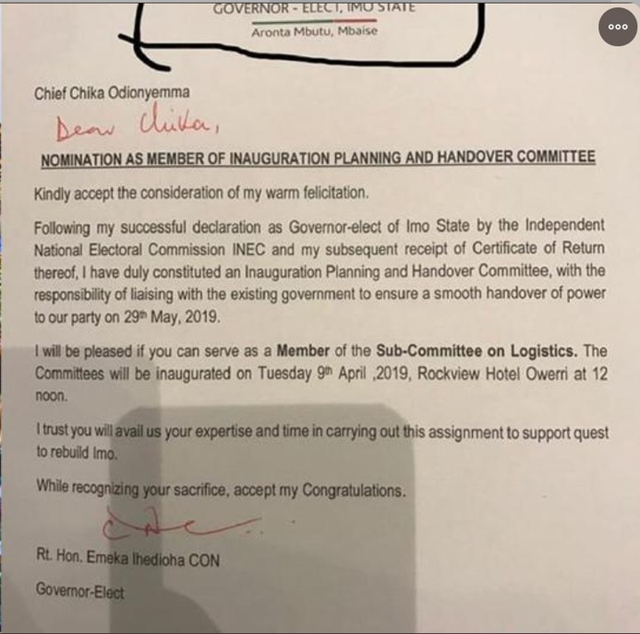 Ihedioha’s Letter Appointing Chika A. Odionyemma Into His Inauguration Committee - 9jaflaver