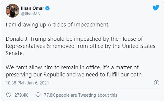 Omar, a Democrat rep from Minnesota, tweeted: “Donald J. Trump should be impeached by the House of Representatives & removed from office by the United States Senate.”