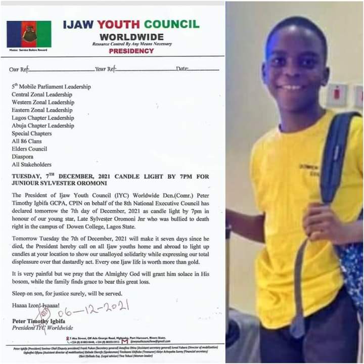 Ijaw Youth Council (IYC) Worldwide have announced a candle light procession for Sylvester Oromoni, the 12-year-old student of Dowen College Lagos that was allegedly bullied to death by fellow students, IgbereTV reports.