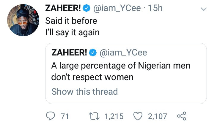 The rapper took to Twitter to retweet a post he shared last year which reads, “A large percentage of Nigerian men don’t respect women.”