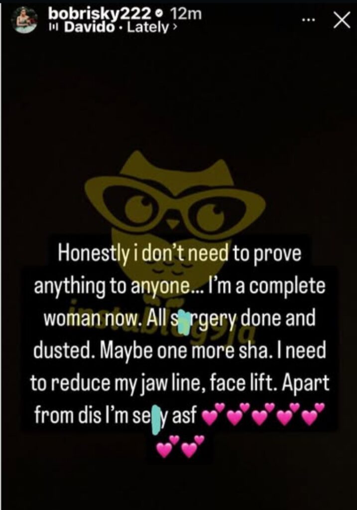 “Honestly i don’t need to prove anything to anyone… I’m a complete woman now. All surgery done and dusted. Maybe one more sha. | need to reduce my jawline, face lift. Apart from dis I’m sexy asf”