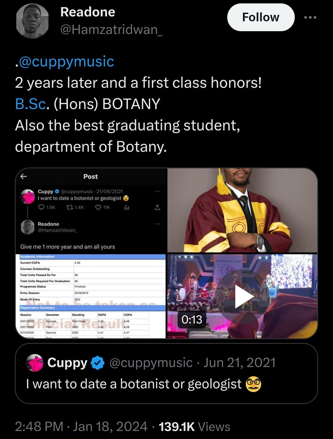 He said: “@cuppymusic, 2 years later and a first-class honors! B.Sc. (Hons) BOTANY. Also the best graduating student, Department of Botany.”