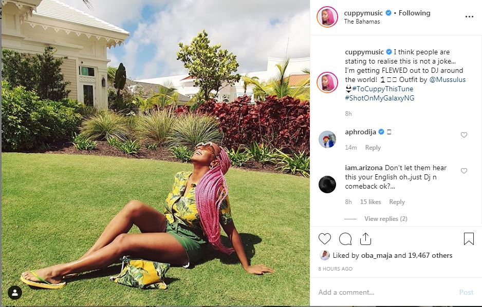 The Nigerian Disc Jockey, DJ Cuppy has revealed that her DJ career is stepping up to a whole new level. In a post on her official IG page, she wrote that it is not a joke anymore adding that she is flown round the world to DJ.