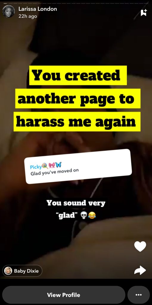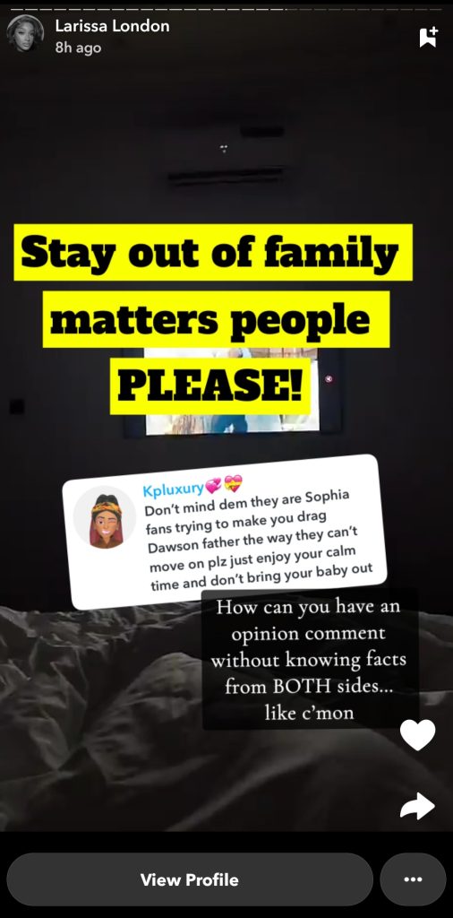 But Larissa replied to the person: “Stay out of family matters people, please. How can you have an opinion comment without knowing facts from both sides… like c’mon.”