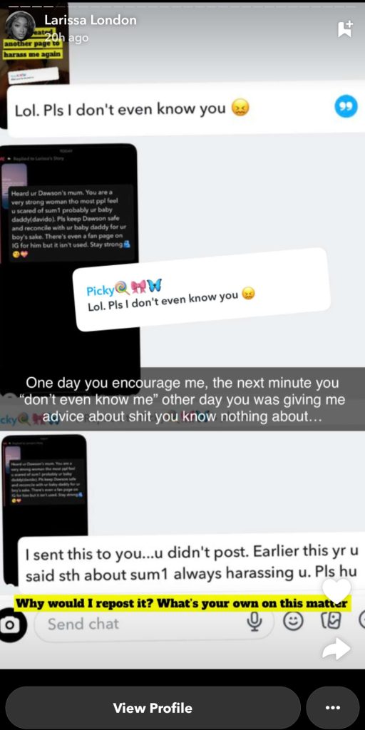 One person told Larissa that Sophia’s fans are trying to get her to also drag Davido, but she should remain calm for the sake of her son.