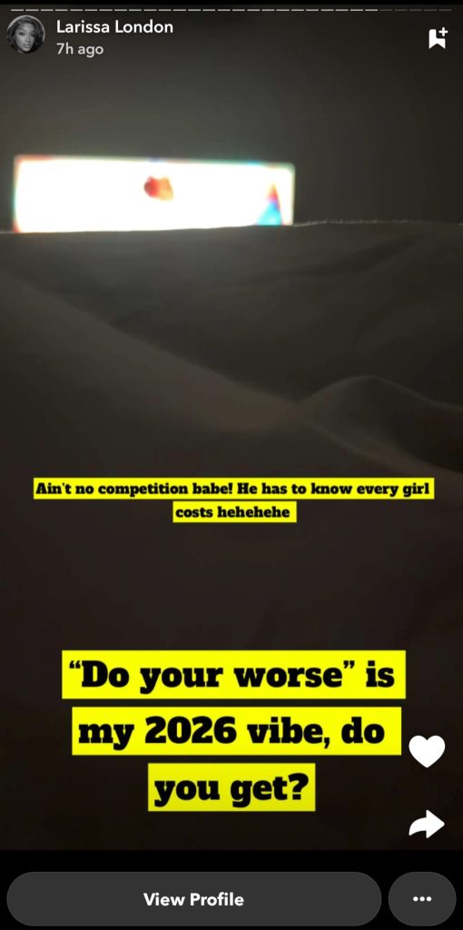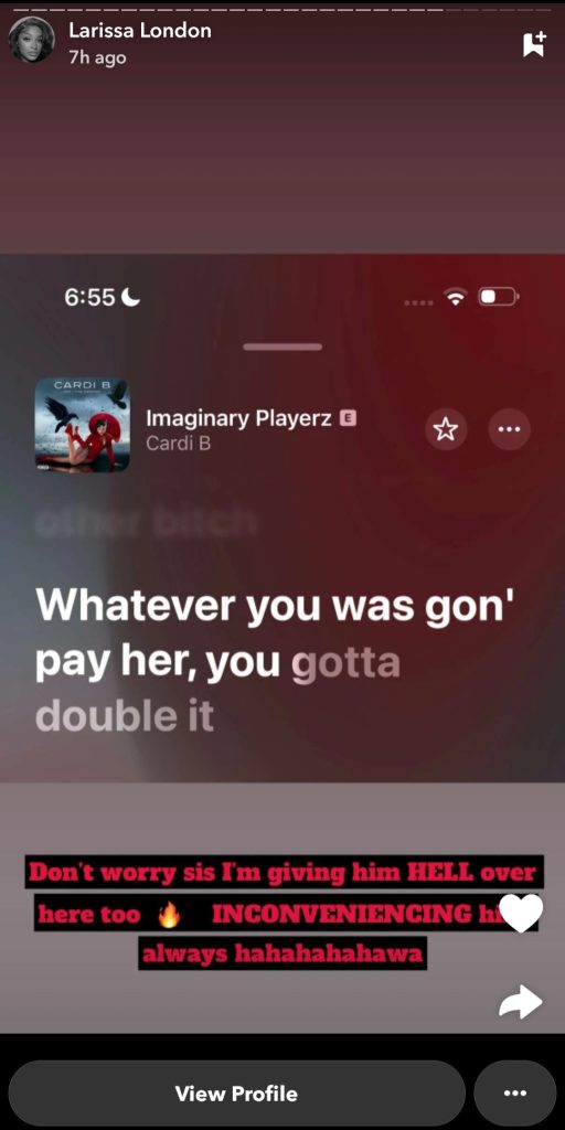 Larissa London, whose real name is Larissa Yasmin Lorenco, shared a line from Cardi B’s song that goes “Whatever you was gon’ pay her, you gotta double it.”