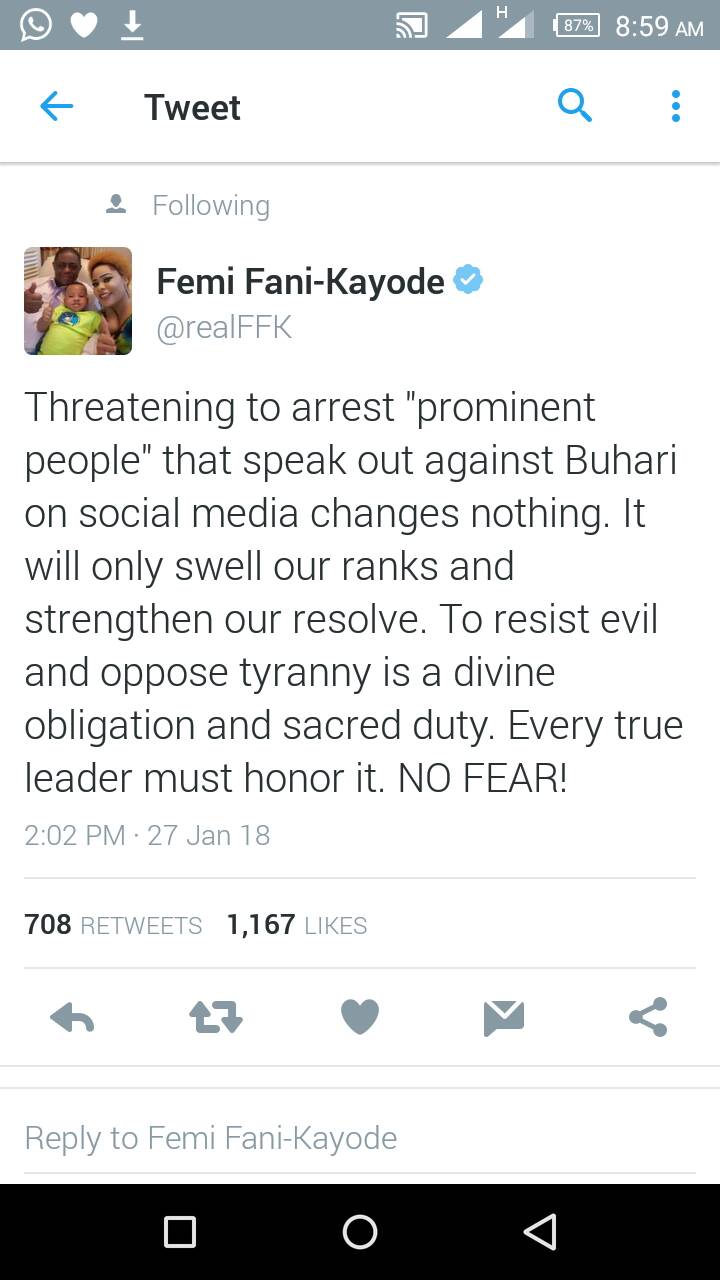 “Threatening to arrest “prominent people” that speak out against Buhari on social media changes nothing. It will only swell our ranks and strengthen our resolve. ”To resist evil and oppose tyranny is a divine obligation and sacred duty. Every true leader must honor it. NO FEAR!