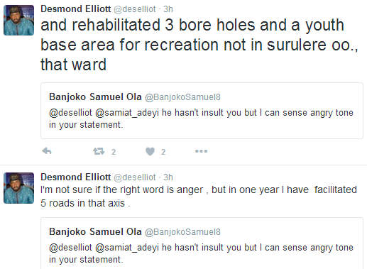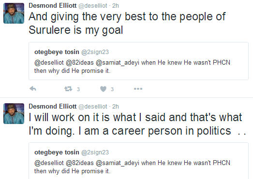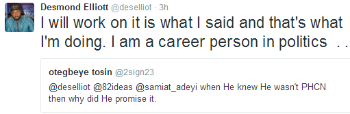 Desmond represents Surulere I constituency at the Lagos state House of Assembly. This was his reply to someone asking about his unfulfilled promise to help with the light situation in her area. Also Replying his critics, Desmond listed his achievement and reminded them that he is a career person in politics.