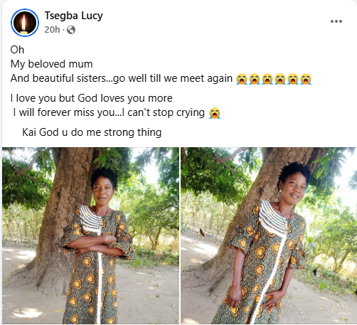 “Oh, My beloved mum. And beautiful sisters…go well till we meet again. I love you but God loves you more. I will forever miss you…I can’t stop crying. Kai God u do me strong thing,” she wrote.