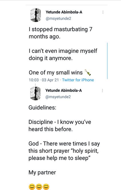 According to Yetunde, she started masturbating at a really young age and overcoming the habit is a win for her.