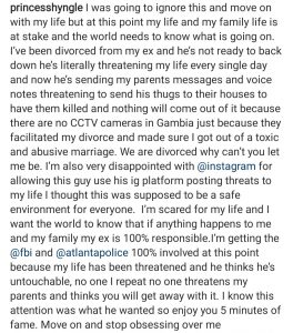 Shyngle shared messages her ex-husband allegedly sent threatening her life and also voicenotes she alleged were from him.