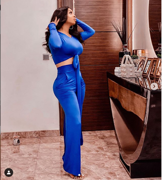 Media personality, Toke Makinwa took to Instagram to share these sexy photos of herself posing in a long sleeve crop top with matching high waisted pants which showcased her massive backside.