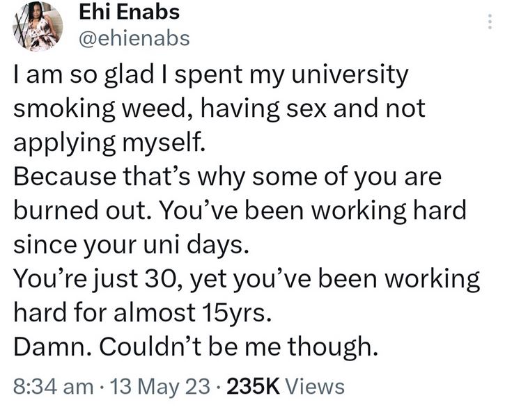 “I am so glad I spent my university smoking weed, having s3x and not applying myself. Because that’s why some of you are burned out. You’ve been working hard since your uni days. You’re just 30, yet you’ve been working hard for almost 15yrs. Damn. Couldn’t be me though.”