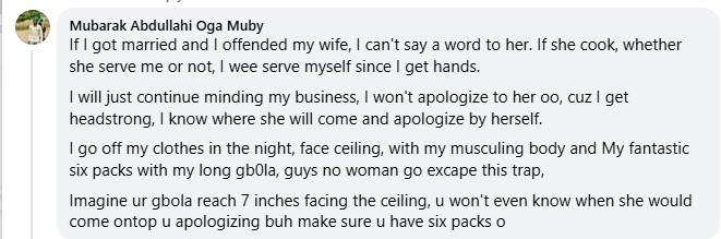 “If I got married and I offended my wife, I can’t say a word to her. If she cooks, whether she serves me or not, I wee serve myself since I get hands. I will just continue minding my business, I won’t apologize to her oo, cuz I get headstrong, I know where she will come and apologize by herself. I go off my clothes in the night, face ceiling, with my musculing body and my fantastic six packs with my long gb0la, guys no woman go escape this trap, Imagine ur gbola reach 7 inches facing the ceiling, u won’t even know when she would come on top u apologizing buh make sure u have six packs,” he wrote.