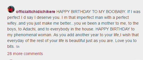 This was contained in a congratulatory message he shared on his IG page to mark her birthday. Nuella and Tchidi got married back in 2013 and have a daughter together. She also shared new photos to mark her big day. See them after the cut.