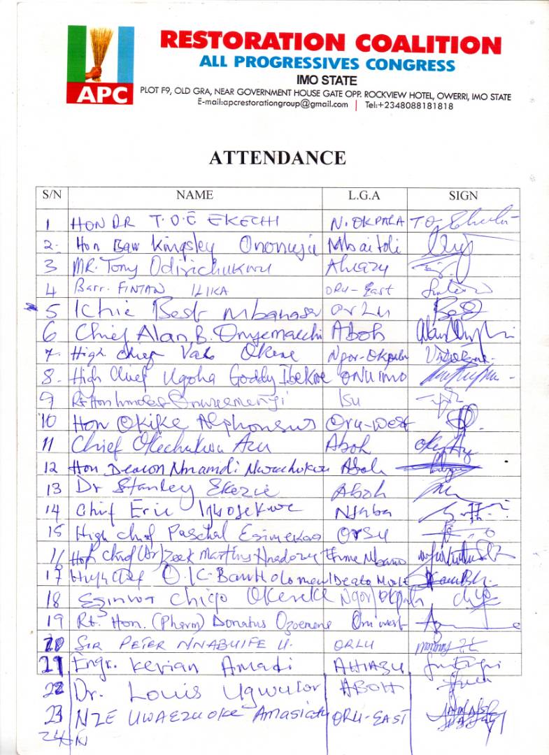5. Certainly, we totally, without any reservation, condemn the clandestine Endorsements, indiscriminate Adoptions and wanton “Anointments” of certain elements in the party without due processes and without any regard to laid down procedures and respect for party leadership and discipline. It is quite disturbing that these endorsements obtained by Blackmail, Coercion and Intimidation are taking place in the hallowed orbit of the Imo State Government House under the watch of the Governor. We are embarrassed because this theatre of the absurdity, as we have confirmed, has the full backing and financial muscles of Imo State Government as the persons being endorsed, one Chief Uche Nwosu, his Son In-Law is also his serving Chief of Staff. As a matter of fact, this is an anomaly and points to a dangerous and destructive party politics of APC in Imo State. We, therefore, call our members to caution as endorsements do not frankly reflect the true picture of Imo APC. We call on Governor Owelle Okorocha to act as a true unifier, a leader to ensure a level playing field for all APC aspirants in all positions. To that effect, we reject in its entirety the endorsements of Uche Nwosu as being currently carried out in our party. This is so because these leprous endorsements have the capacity and capability of truncating and dismantling the very cord that binds us together as family. We respectfully urge Governor Okorocha to be very sensitive to the name, integrity and sanctity of Imo as an entity and the thrust, honour and dignity that go with the governorship enterprise.