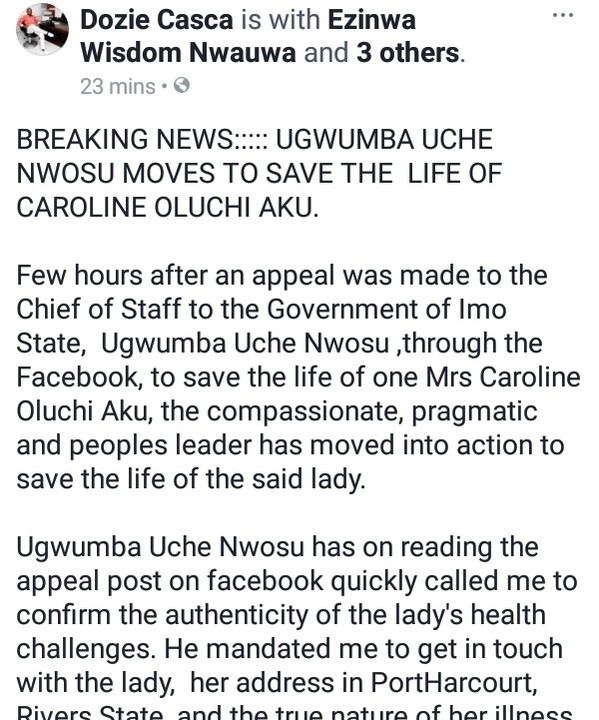 Few hours after an appeal was made to the Chief of Staff to the Government of Imo State, Ugwumba Uche Nwosu ,through the Facebook, to save the life of one Mrs Caroline Oluchi Aku, the compassionate, pragmatic and peoples leader has moved into action to save the life of the said lady.