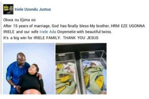 Irika Dalphine Ugochi, wrote: “God never ever fails,thank you Jesus !!! After 15 years of waiting Jesus came through. We have a prince and a princess(twins) Congratulations. HRH. Eze ugonna iriele, Duruosimmiri IV.”