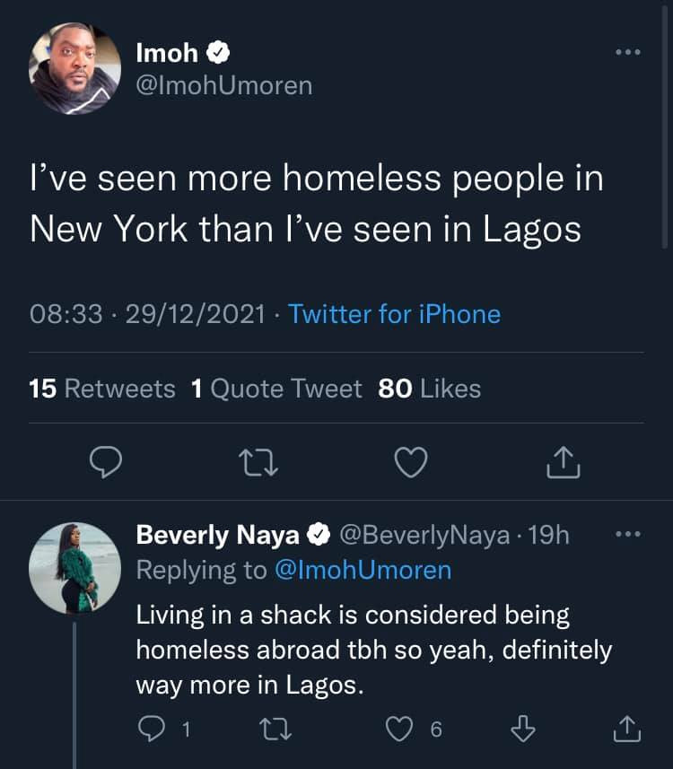 In response to his tweet, actress Beverly Naya, stated that living in a shack abroad is considered as being homeless however, she negated his stance that there are more homeless folks abroad.