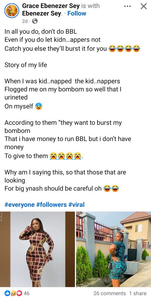 She went on to warn women who have undergone Brazilian Butt Lift to ensure they don’t get kidnapped.