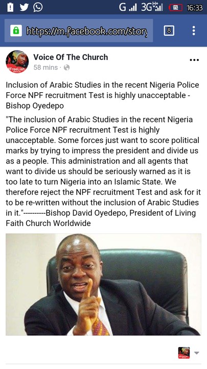 “The inclusion of Arabic Studies in the recent Nigeria Police Force NPF recruitment Test is highly unacceptable. Some forces just want to score political marks by trying to impress the president and divide us as a people. This administration and all agents that want to divide us should be seriously warned as it is too late to turn Nigeria into an Islamic State. We therefore reject the NPF recruitment Test and ask for it to be re-written without the inclusion of Arabic Studies in it.”———-Bishop David Oyedepo, President of Living Faith Church Worldwide
