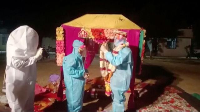 The couple, whose names were not made public, decided to go ahead with the ceremony on Sunday in the courtyard of the COVID quarantine centre in Baran in the western state of Rajasthan – their protective gear giving it an otherworldly feel.