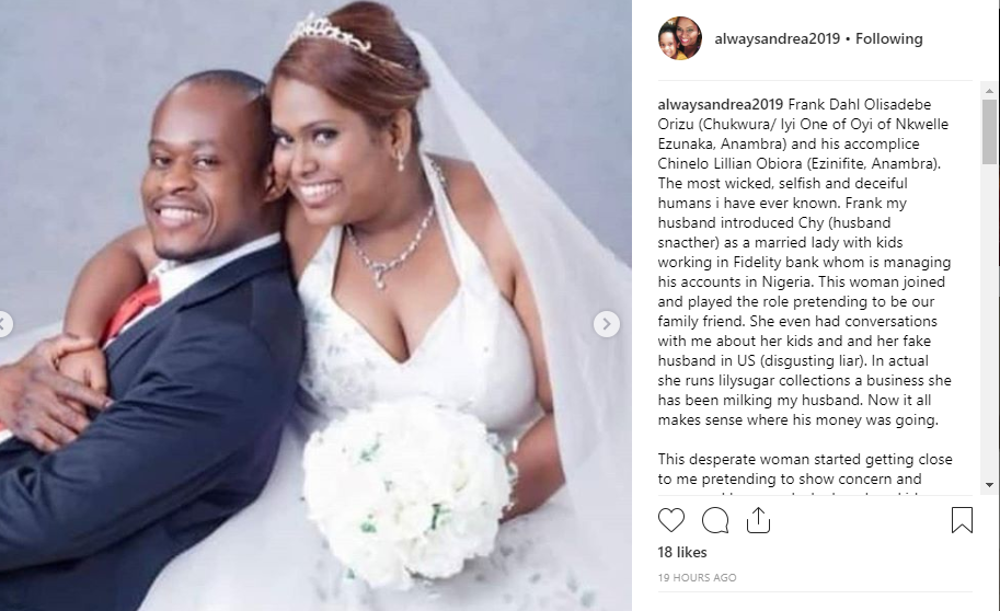 An Indian lady, Andrea Orizu pictured left, has taken to Instagram to call out her husband’s bank account manager for allegedly snatching her husband and marrying him after pretending to be a family friend.