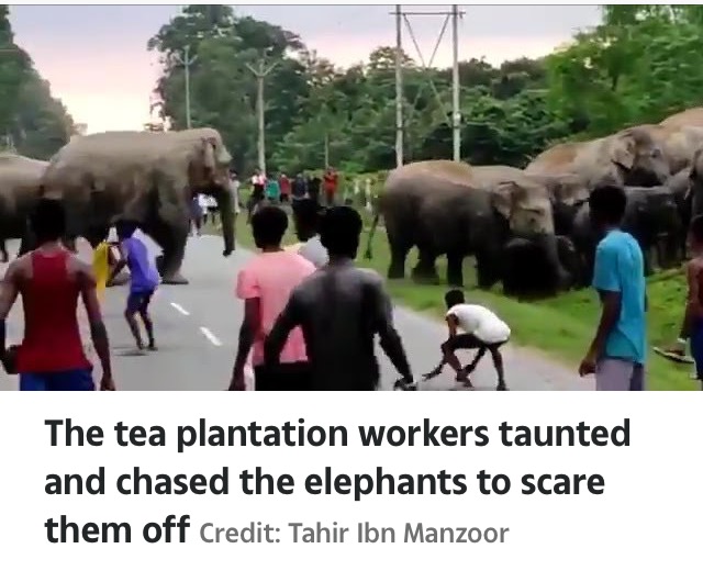 The animals were calmly crossing a road in north east India in search of food when a swarm of workers started taunting and chasing the elephants in a bid to scare them off.