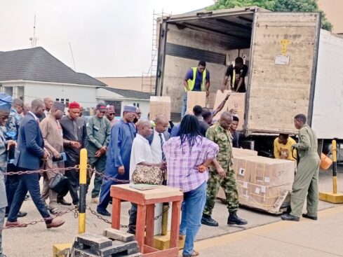 The INEC Chairman, Prof. Mahmood Yakubu, observed airlifting of the machines at the Murtala Muhammed International Airport, Lagos.