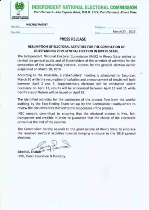 A statement signed by Edwin Enabor, Head of Department, Voter Education and Publicity of INEC in Rivers State, on Wednesday noted that the process would continue on April 2.