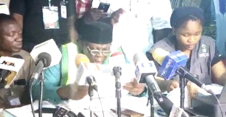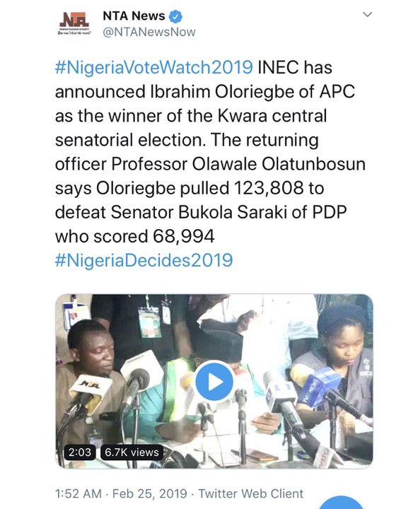 Here is the moment INEC announced Ibrahim Oloriegbe of APC as the winner of the Kwara central senatorial election.
