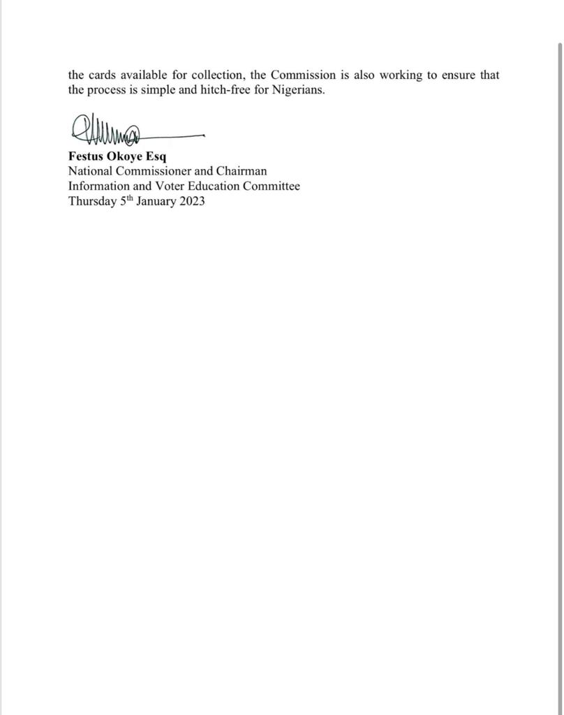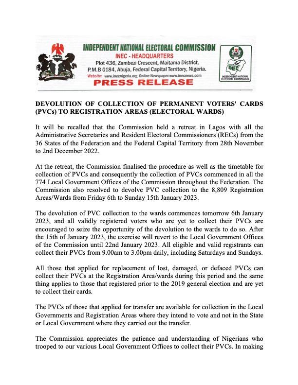 Those who are unable to collect their PVCs at the LGA offices of the Commission can do so at the Registration Areas/Wards.