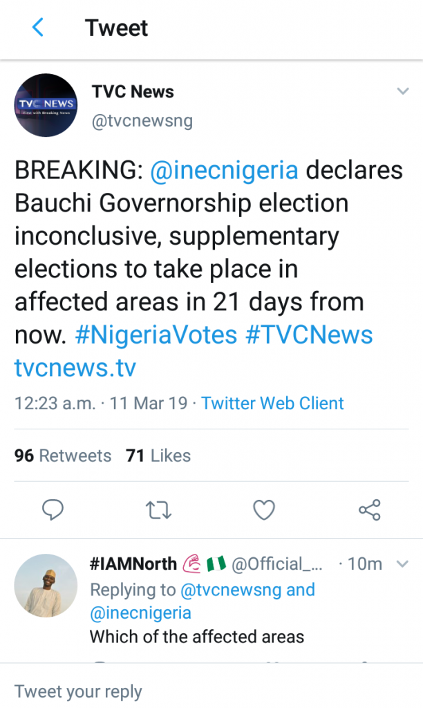 BREAKING: @inecnigeria declares Bauchi Governorship election inconclusive, supplementary elections to take place in affected areas in 21 days from now. #NigeriaVotes #TVCNews