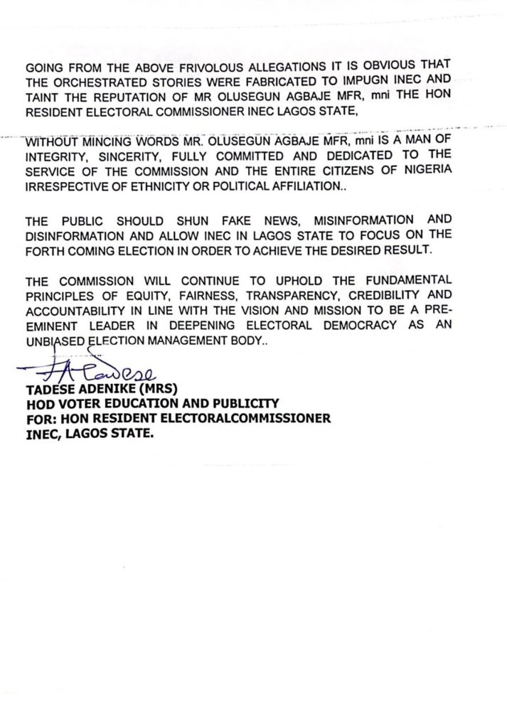 THE HON, RESIDENT ELECTORAL COMMISSIONER FOR LAGOS STATE MR OLUSEGUN AGBAJE MFR, mni DID NOT-AT ANY POINT IN TIME ENGAGE IN ANY TELEPHONE CONVERSATION WITH THE THREE CANDIDATES MENTIONED – OBIDIENTS, SANWO OLU AND TINUBU IN FACT HE DOES NOT HAVE THEIR TELEPHONE NUMBERS. WHOEVER THAT HAS INFORMATION CONCERNING THE DAY AND TIME OF THE SAID TELEPHONE CONVERSATION SHOULD NOT HESITATE TO MAKE IT PUBLIC..