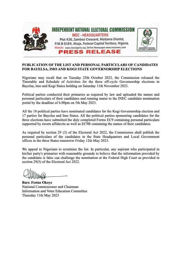 Publication of the List and Personal Particulars of Candidates for Bayelsa, Imo and Kogi State Governorship Elections