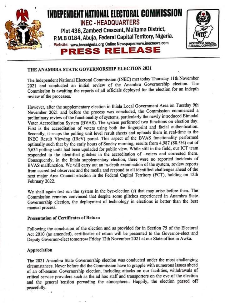 Following the conclusion of the election and as provided for in Section 75 of the Electoral Act 2010 (as amended), certificates of return will be presented to the Governor-elect and Deputy Governor-elect tomorrow Friday 12th November 2021 at our State office in Awka.