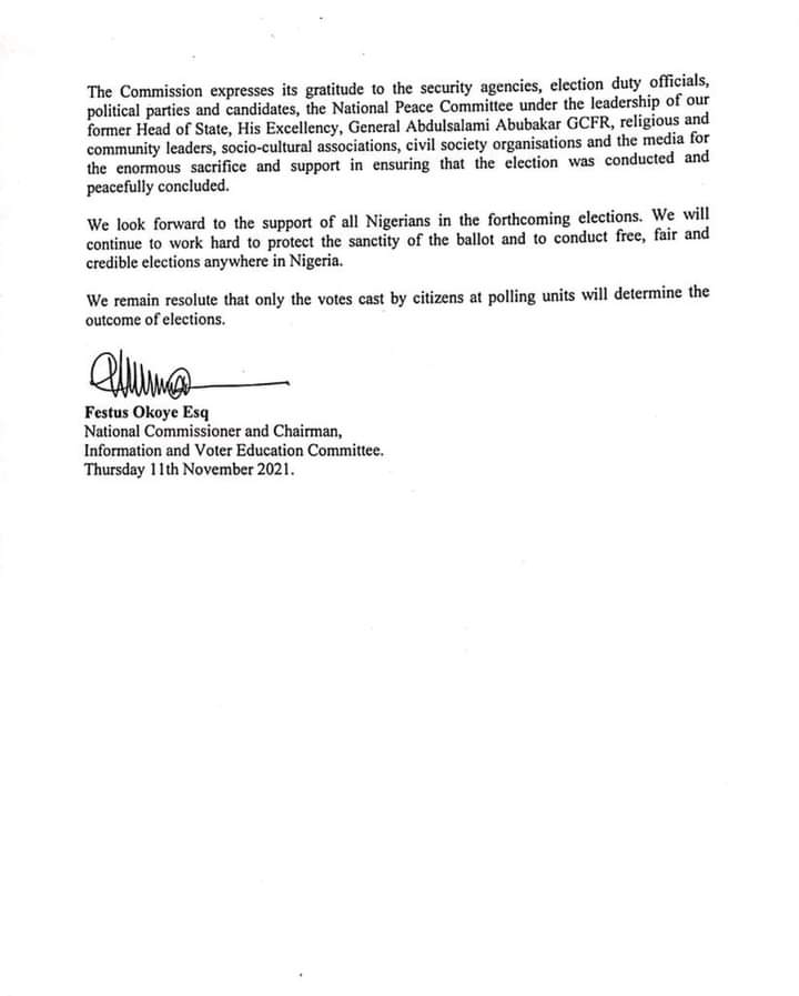 The Commission expresses its gratitude to the security agencies, election duty officials, political parties and candidates, the National Peace Committee under the leadership of our former Head of State, His Excellency, General Abdulsalami Abubakar GCFR, religious and community leaders, socio-cultural associations, civil society organisations and the media for the enormous sacrifice and support in ensuring that the election was conducted and peacefully concluded.