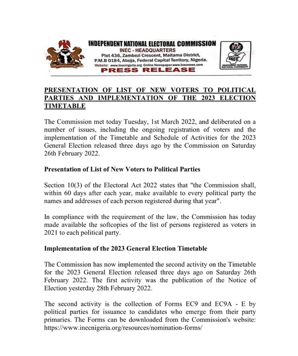 PRESENTATION OF LIST OF NEW VOTERS TO POLITICAL PARTIES AND IMPLEMENTATION OF THE 2023 ELECTION TIMETABLE