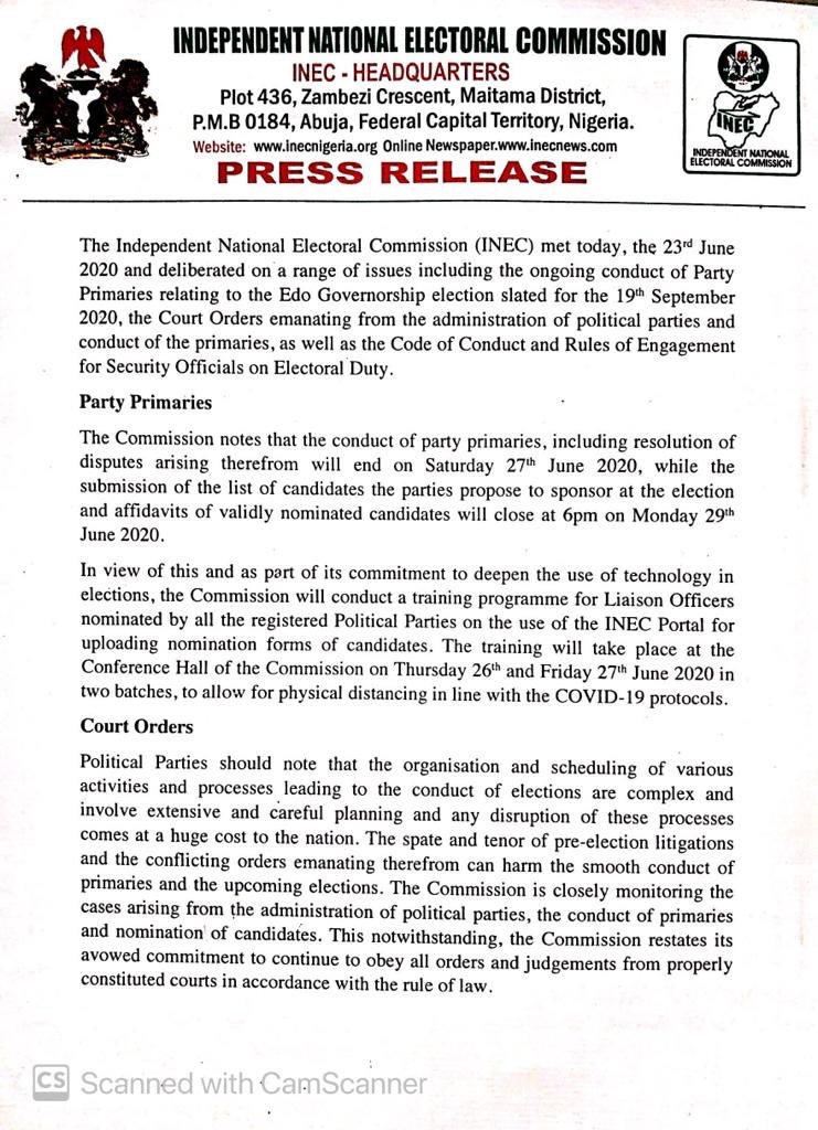 INEC Reacts To Edo APC, PDP Crisis Over Primaries: "We Will Obey Court Orders" - 9jaflaver