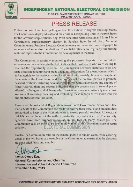 Here is INEC’s Press Release on the Bayelsa and Kogi Governorship elections…