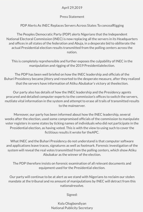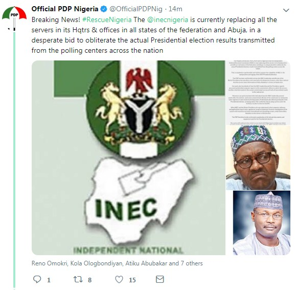 The Peoples Democratic Party (PDP) alerts Nigerians that the Independent National Electoral Commission (INEC) is now replacing all the servers in its Headquarters and offices in all states of the federation and Abuja, in a desperate bid to obliterate the actual Presidential election results transmitted from the polling centers across the nation.