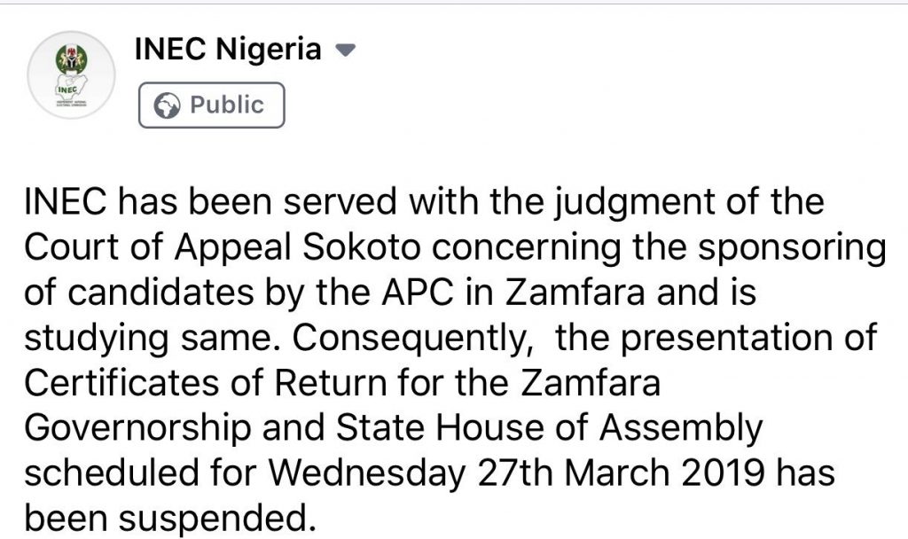 The Independent National Electoral Commission (INEC) has suspended the presentation of certificates of return to candidates of the All Progressives Congress (APC) in Zamfara state.
