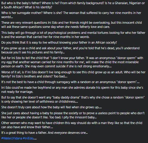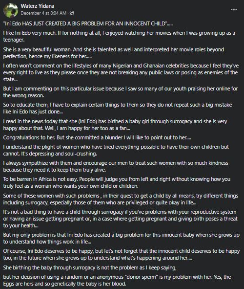 Nigerian actress, Ini Edo has been called out by writer Waterz Yidana for giving birth to a baby using a sperm donor.