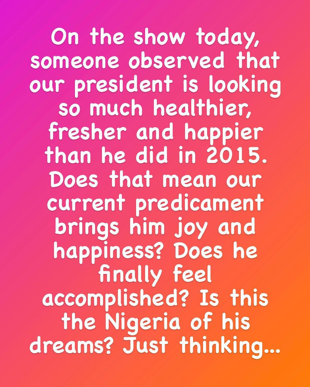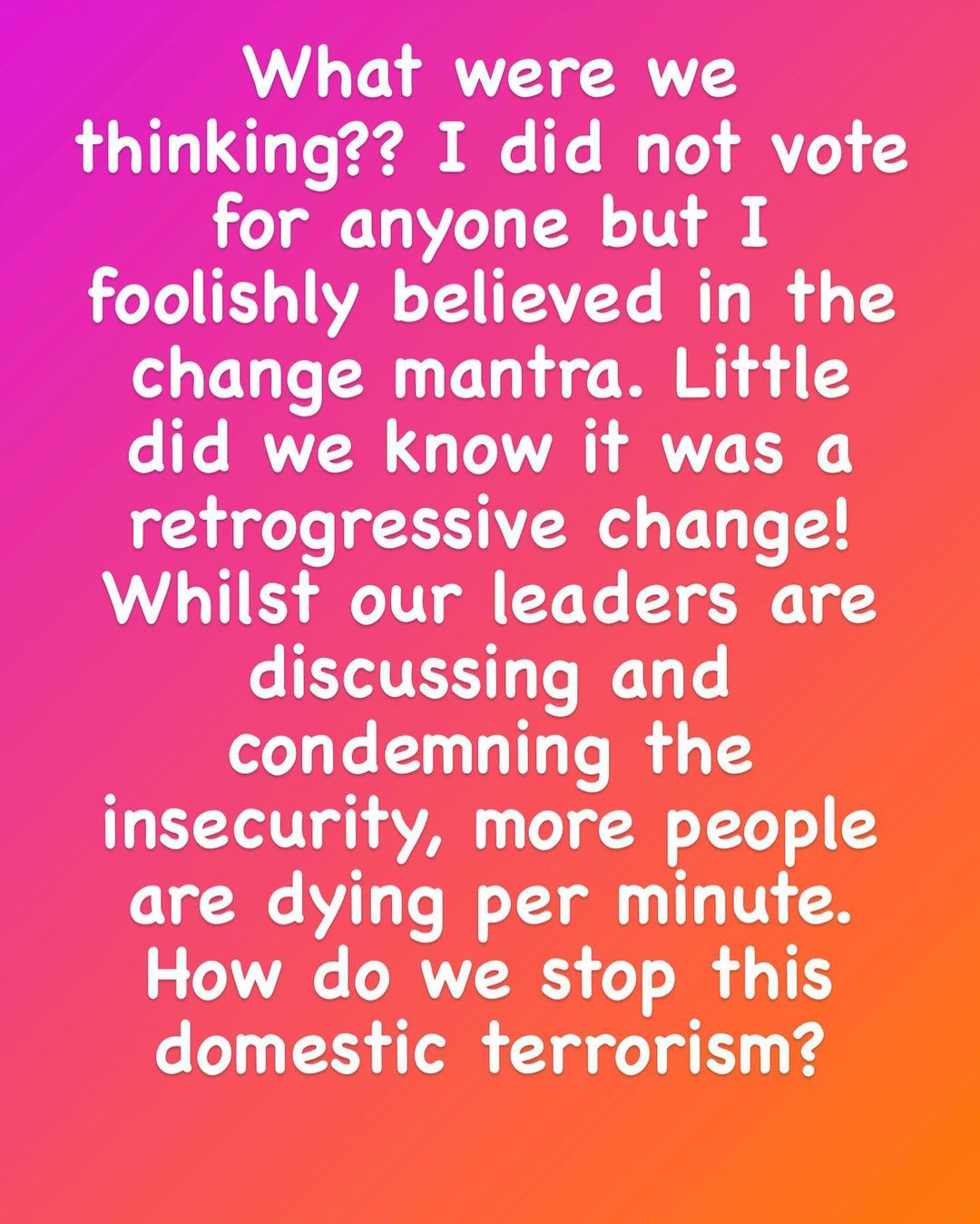 According to her, she foolishly believed in President Muhammadu Buhari’s change mantra not knowing that it was a retrogressive change. See her posts below: