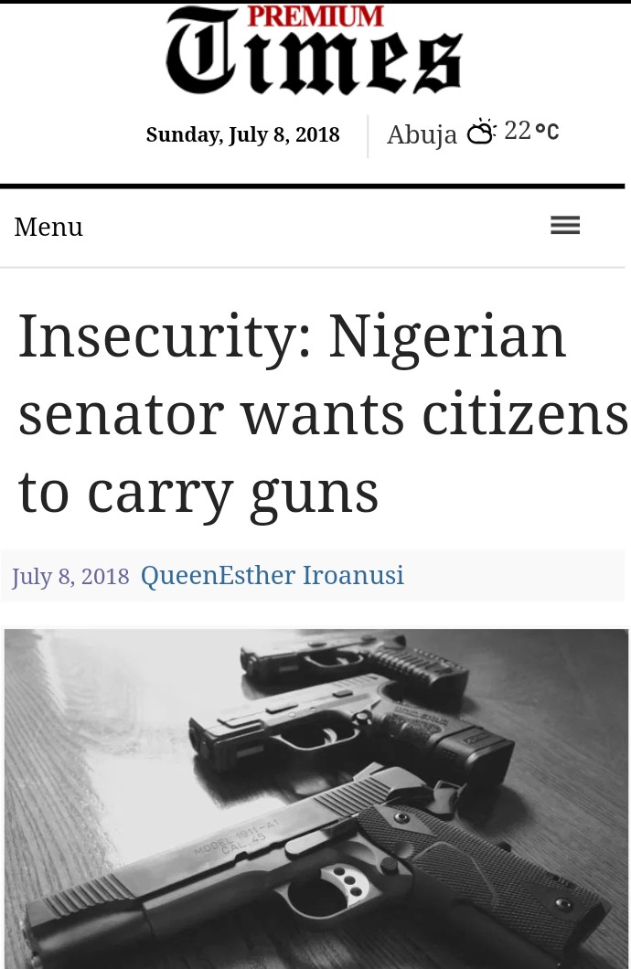 On Tuesday, while contributing to a debate at the Senate on the insecurity across Nigeria, the senator called for legalisation of guns and firearms to enable citizens defend themselves.