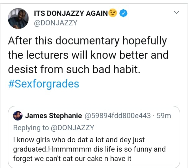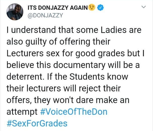 “I understand that some Ladies are also guilty of offering their Lecturers sex for good grades but I believe this documentary will be a deterrent. If the Students know their lecturers will reject their offers, they won’t dare make an attempt #VoiceOfTheDon #SexForGrades”