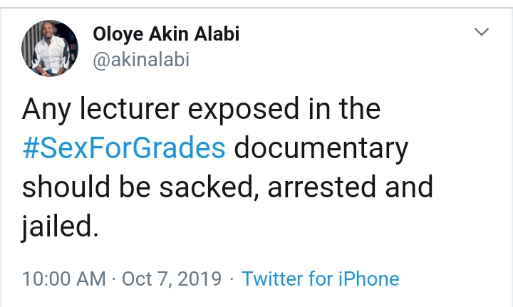 “Any lecturer exposed in the #SexForGrades documentary should be sacked, arrested and jailed.”
