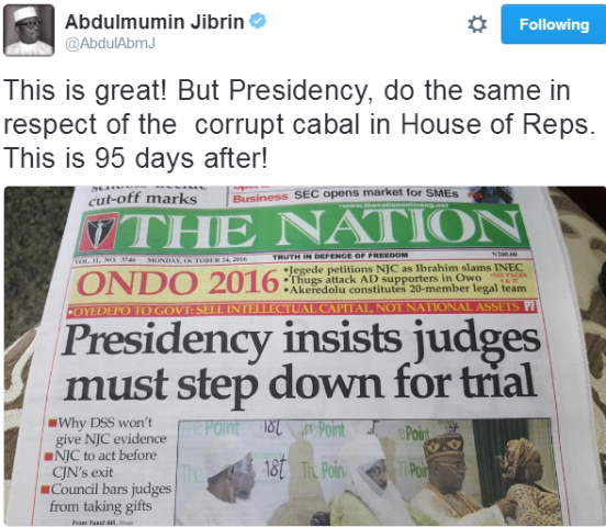 The suspended lawmaker tweeted this in reaction to reports that the presidency is insisting that the senior judges who were recently arrested and detained over allegations of corruption must step down for trial.